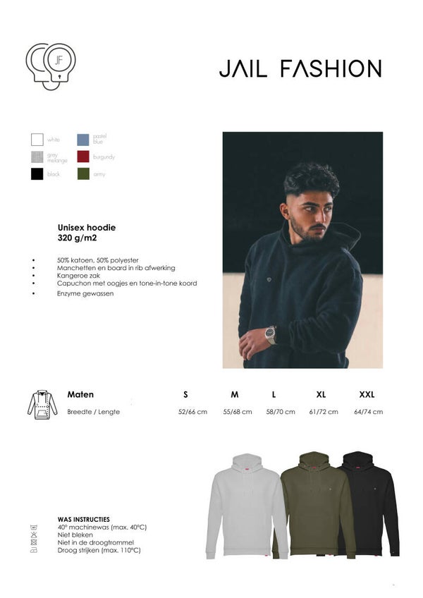 Een fijne hoodie, verkrijgbaar in diverse kleuren. De hoodie is gemaakt van een zachte katoenen/polyester stof met een binnenkant van geborsteld fleece. Op de borst staat het logo van Jail Fashion in de vorm van handboeien.